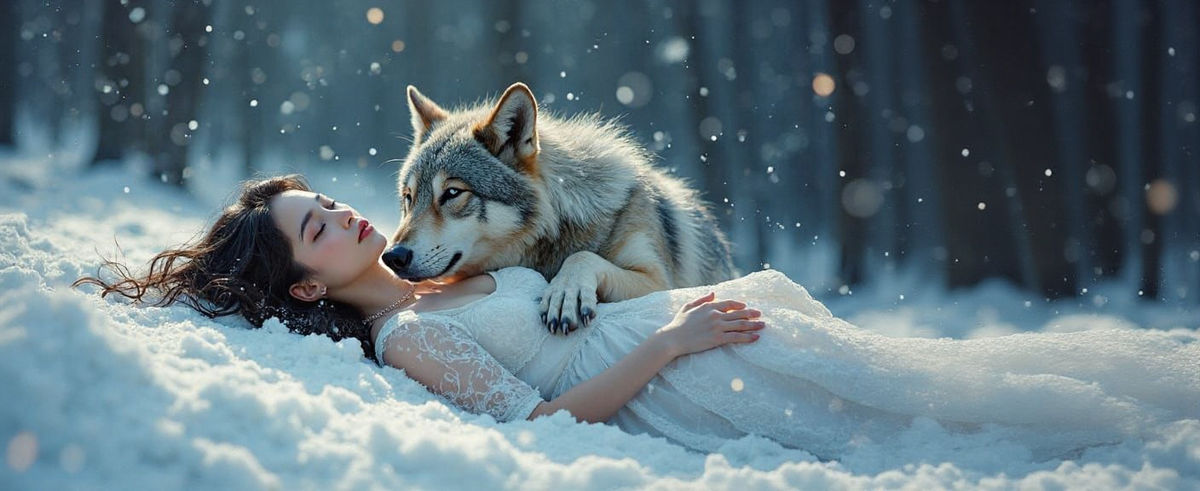 A captivating image of a sleeping princess in a snowy forest with a wolf. The scene, reminiscent of Snow White, is rendered as a textured speedpaint with a mystical aesthetic.