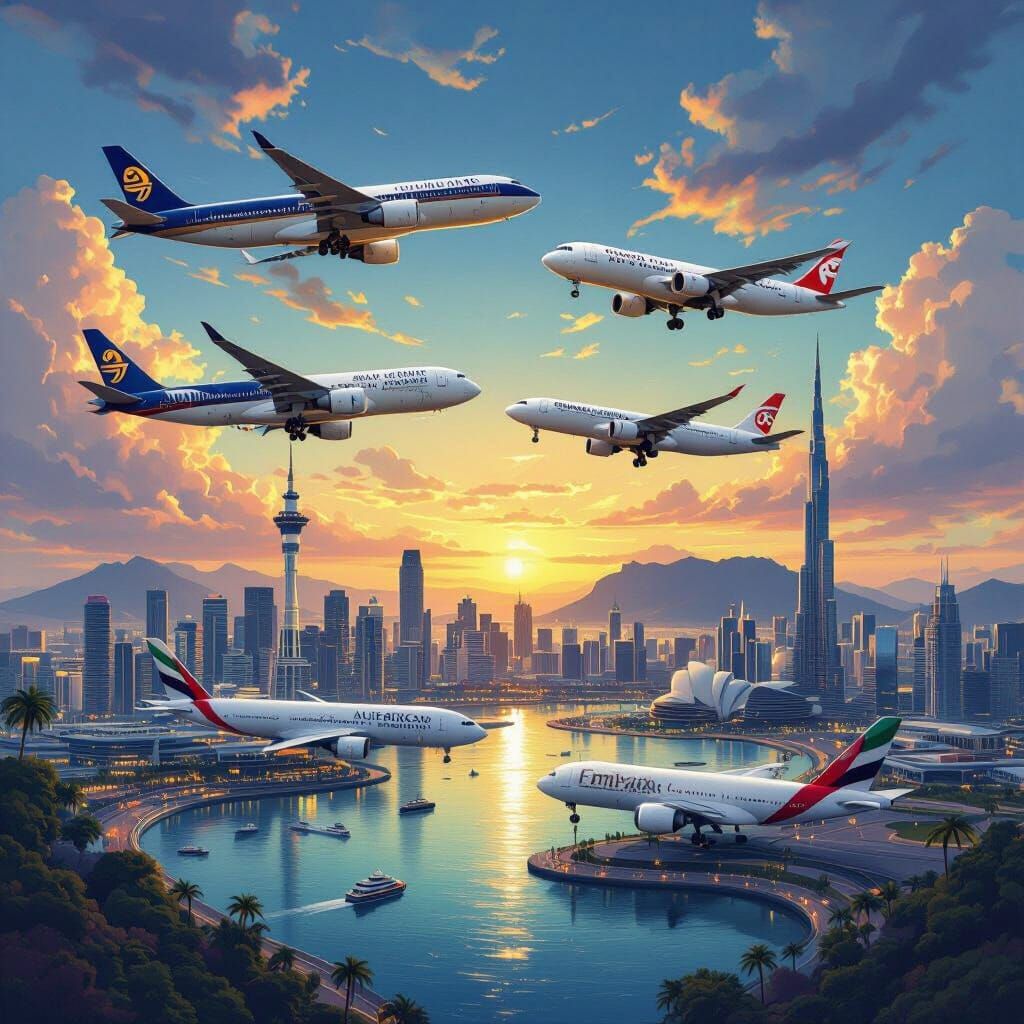 This image shows various airlines flying over iconic landmarks. It is a detailed matte painting with deep, complementary colors and fantasy concept art elements. The aesthetic evokes a nostalgic yet futuristic atmosphere.
