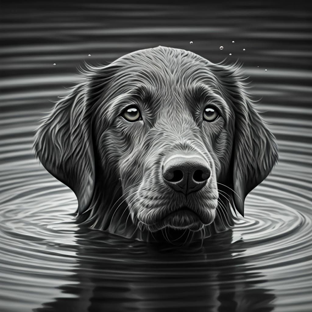 A highly detailed black and white pencil drawing of a dog, likely a Labrador or Retriever, submerged in rippling water, with intricate texture and shading capturing its fur and expressive face.