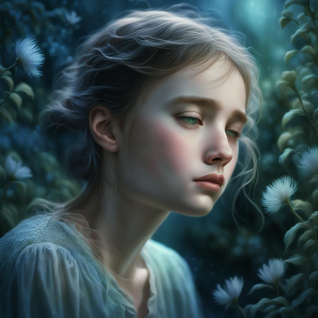 This image shows a bashful young woman with flushed cheeks looking down in a moonlit garden. Impressionistic soft focus, feathery brushstrokes, and ethereal lighting create a dreamy, surreal scene in pastel colors.