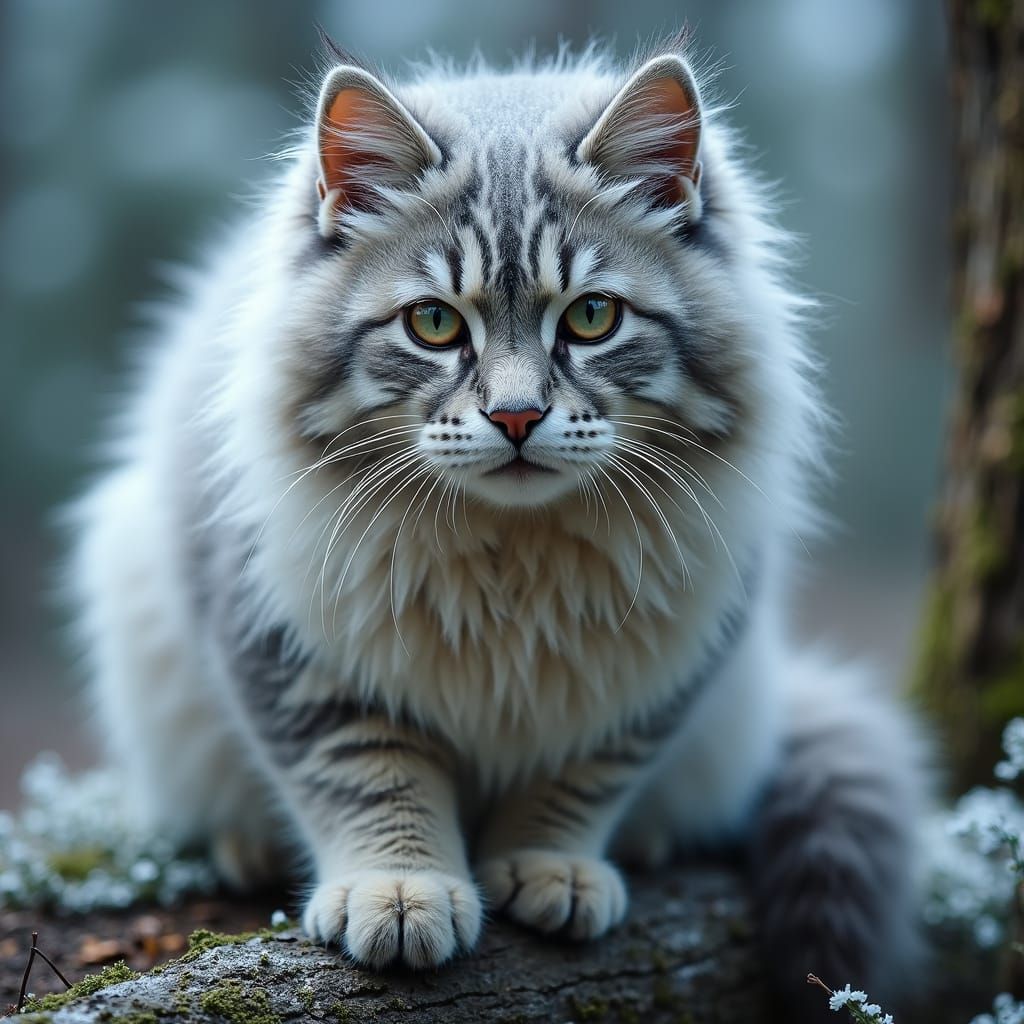 A majestic Norwegian Forest Cat, inspired by Norse legends of the Skogkatt. The image captures the fairy cat's strength and beauty, referencing its mythical association with Freyja.