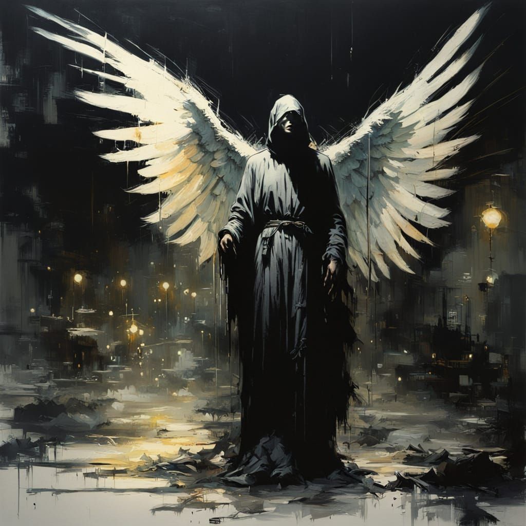 A haunting image of the Angel of Death standing amidst a gritty, film noir-inspired cityscape, illuminated by dramatic, high-contrast lighting, evoking a sense of timeless, urban decay.