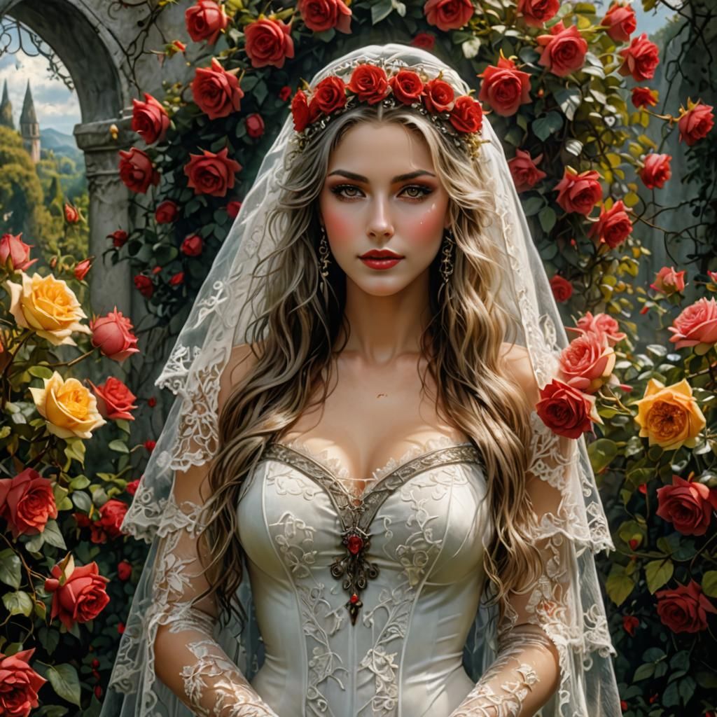 This image shows a beautiful woman with a silver crown and long white lace veil, standing in an overgrown rose garden. The image is a hyperdetailed 3D digital art piece.
