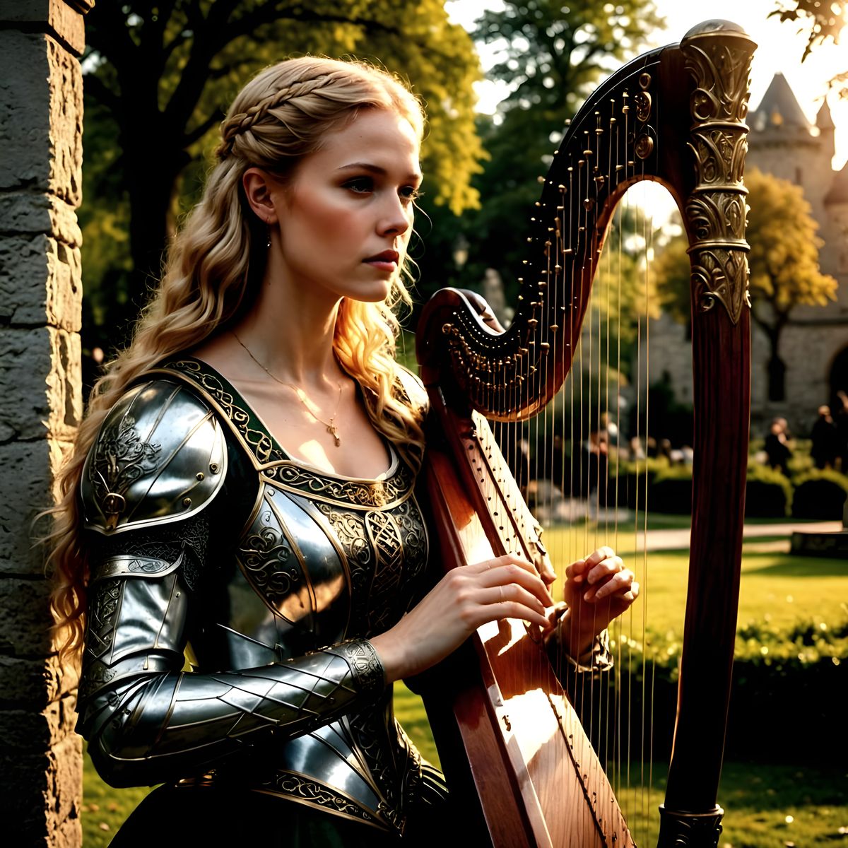 A beautiful blonde knight plays a Celtic harp in the palace gardens, watched by other attentive women knights. The image is rendered in a detailed, realistic style with cinematic lighting.