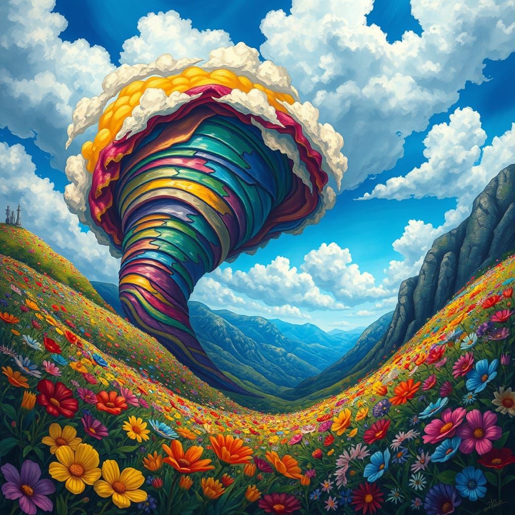 This image depicts a fantastical scene of a rainbow-colored tornado tearing through a lush valley filled with a kaleidoscope of rainbow-hued flowers, set against a brilliant blue sky with puffy white clouds, evoking a dreamlike quality reminiscent of Japanese animation and surreal realism.