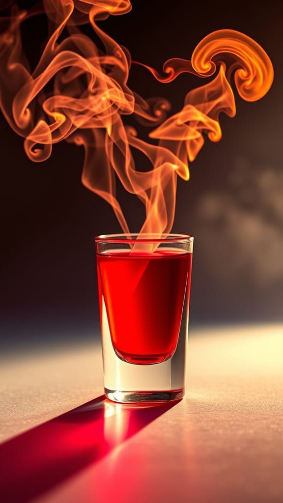 This image showcases a mesmerizing, transparent steam spiraling out of a shot glass, illuminated by intense sunlight and vibrant red liquid, with intricate patterns and soft textures, set against a subtle gradient background, evoking the dreamy quality of surrealist art