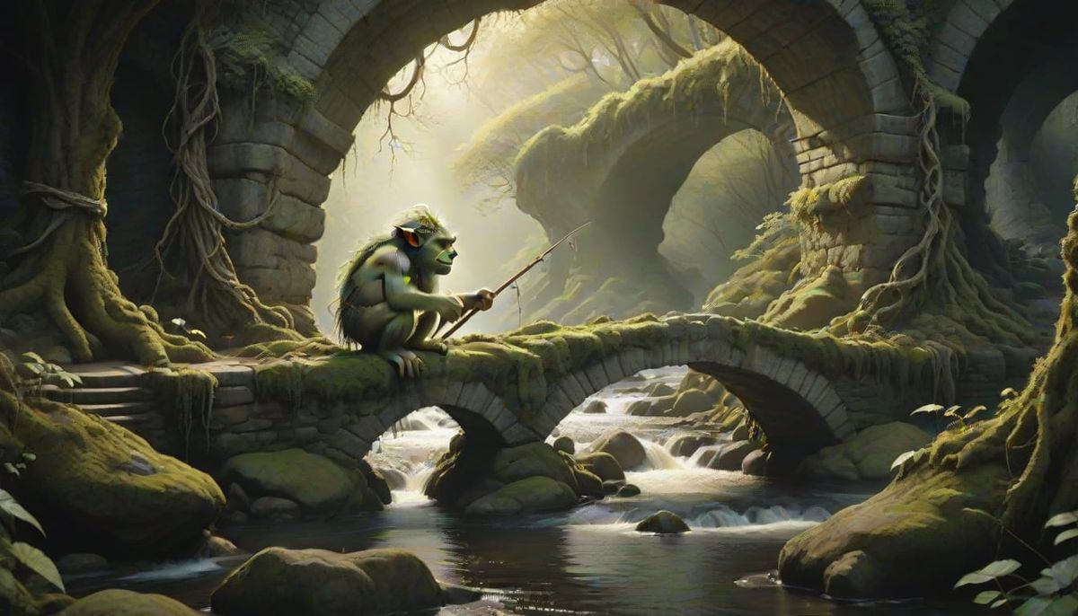 This image shows a troll concealed beneath a stone bridge over a flowing river. The troll clutches a vine fishing rod in a dense, old-growth forest, rendered in a dark fantasy style with dramatic lighting.