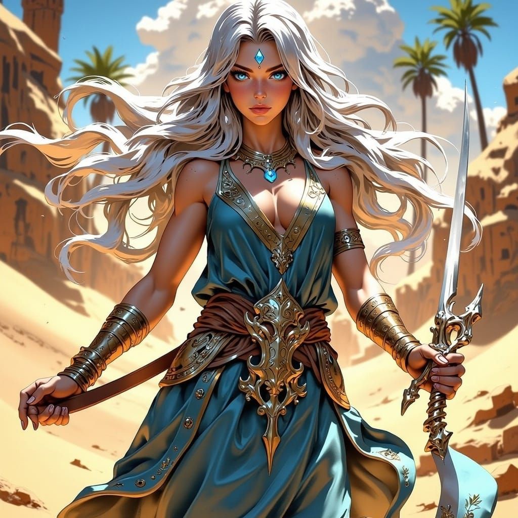 This image shows a majestic anime female warrior with silver hair and blue eyes in a desert setting. The full-body shot features her in traditional dress, holding a scimitar, with a blurred background and serene atmosphere.