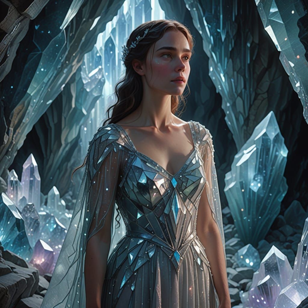 A captivating image of a woman in a crystal cave, reminiscent of Pre-Raphaelite paintings. She wears a shimmering gown in soft pastel colors, illuminated by ethereal light.