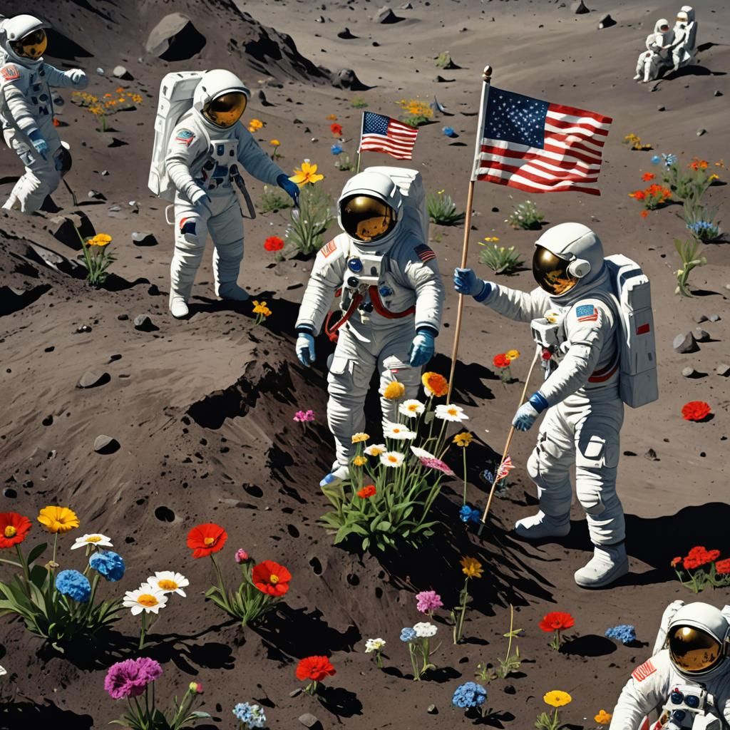 A detailed, realistic sci-fi scene on the moon. The image depicts three astronauts replacing an American flag with vibrant flowers, set against a backdrop of Earth with faded colors.