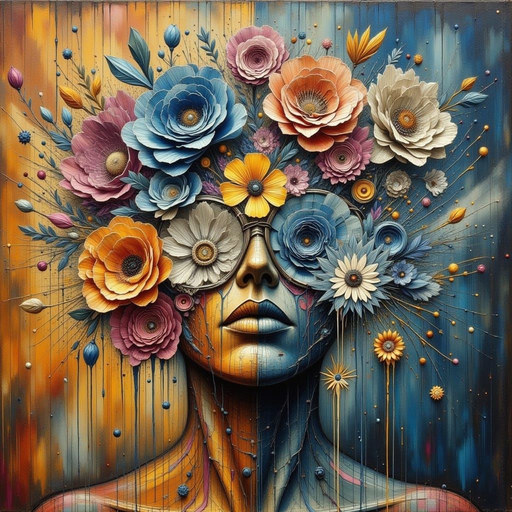 This abstract image explores the duality of emotions, depicting the delicate balance between love and hate through textured, surreal, and fragmented artistic elements.