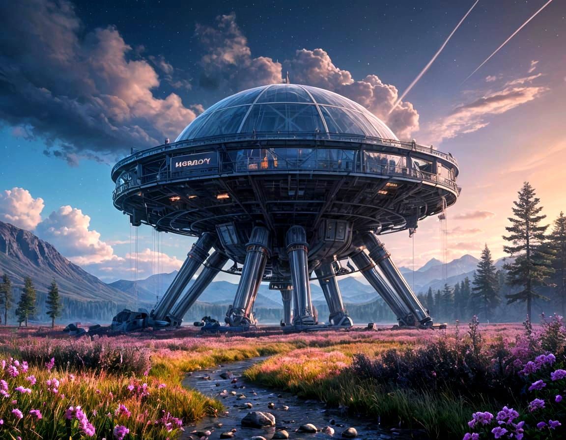 A surreal image of an ethereal scene with vibrant colors. The picture evokes a mystical, dreamlike quality, reminiscent of digital and concept art with cosmic landscapes.
