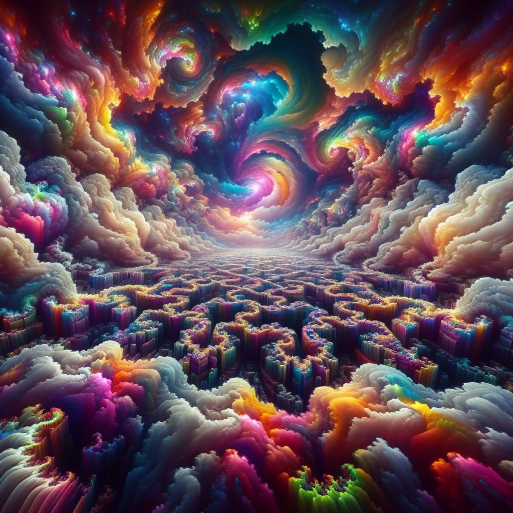 A mesmerizing image displaying vivid, multicolored cloud fractals in twisting, maze-like patterns. The sky transforms into a glistening, kaleidoscopic canopy, creating an otherworldly, dreamlike scene.