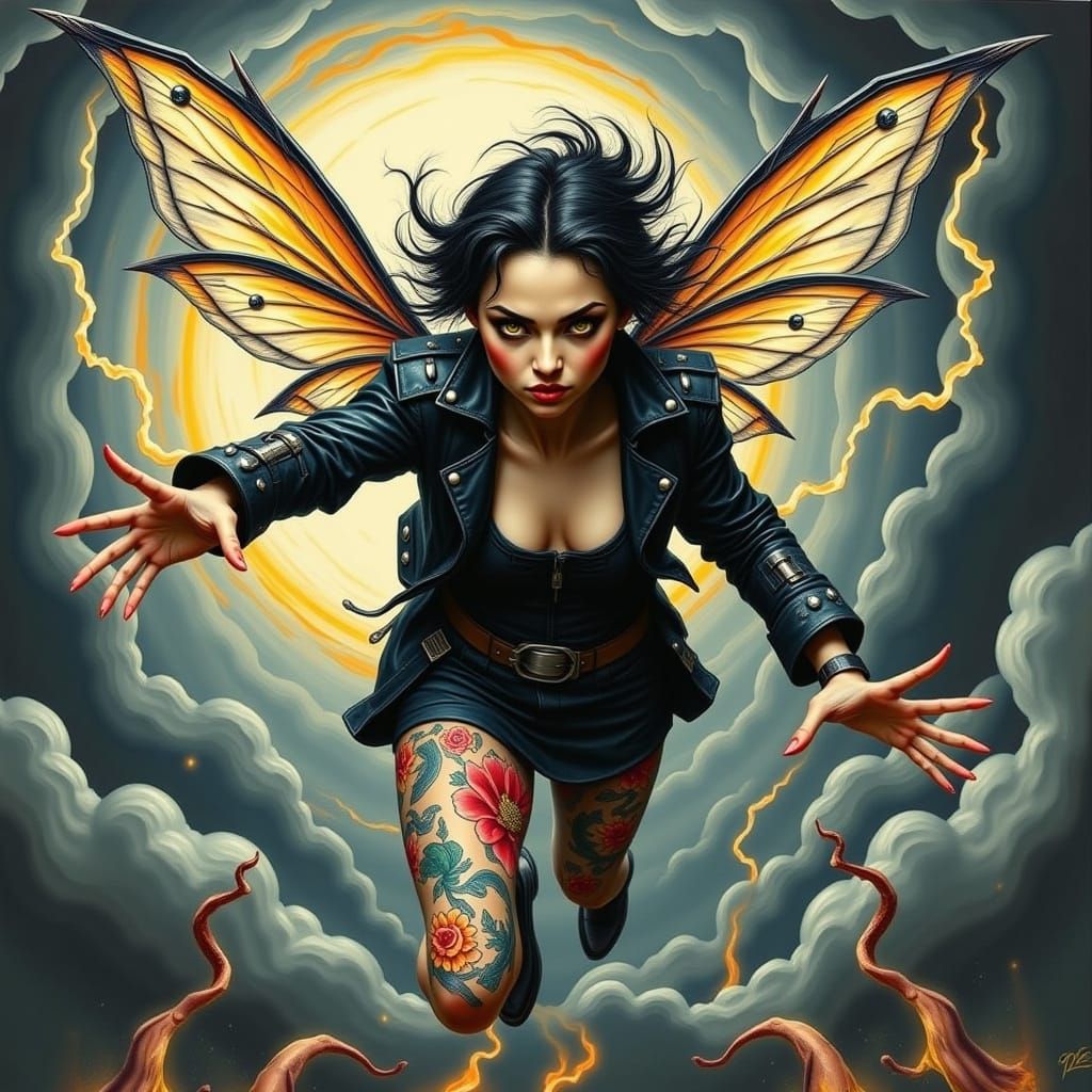 This image depicts a fearless fairy in mid-flight, surrounded by swirling heavy metal-inspired clouds and lightning. Her black leather jacket and vibrant tattoos of serpents, skulls, and roses showcase her bold personality, with a dramatic, high-contrast style and dynamic movement.