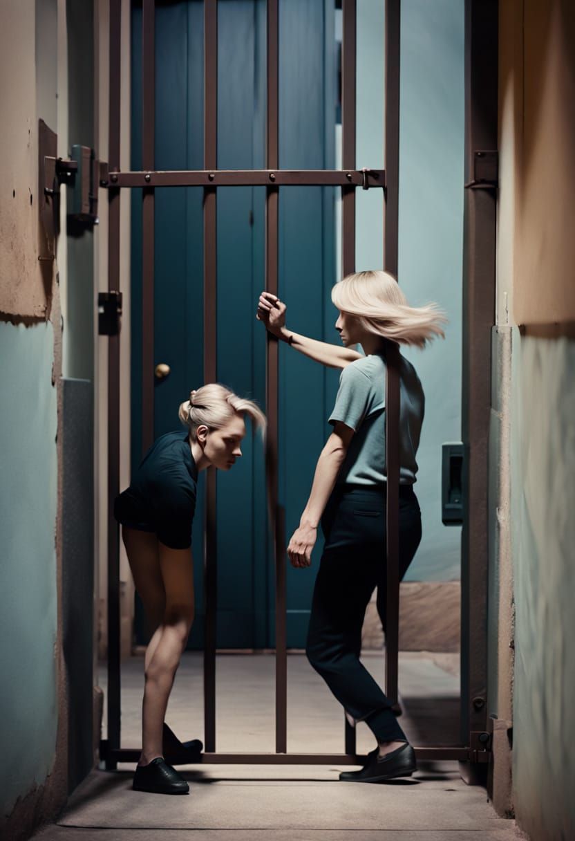 This minimalist film still captures a person closing a gate and standing in a dimly lit hallway. The scene features deep shadows and muted earth tones for a moody atmosphere.