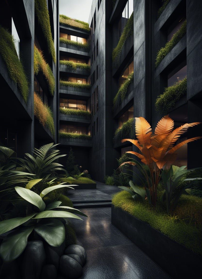A striking picture of a surreal, modern university building. The image features black concrete architecture, interspersed with plants, rendered with detailed textures and warm colors.
