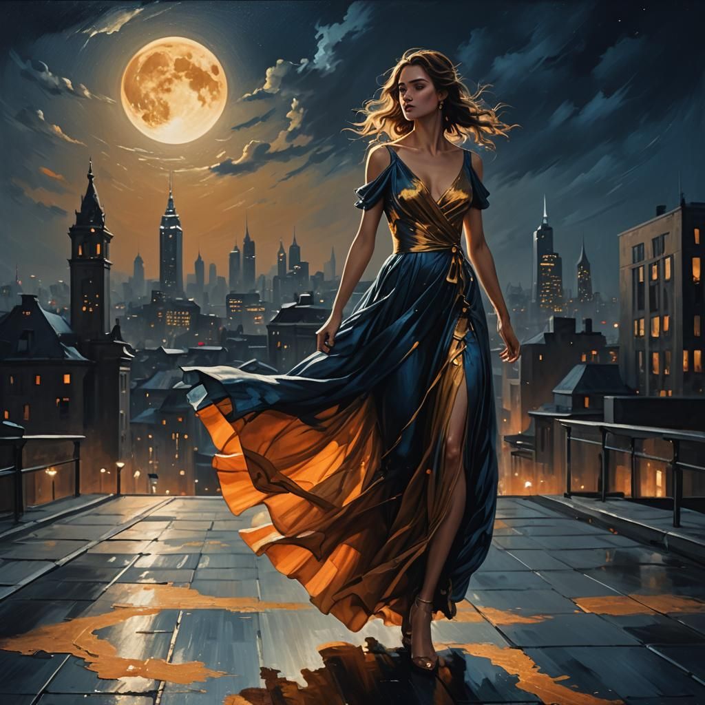 This image shows a lone woman in a flowing dress silhouetted against a nocturnal cityscape. The artwork features a rich color palette and textures reminiscent of oil on canvas, with detailed wind and cloth simulations.