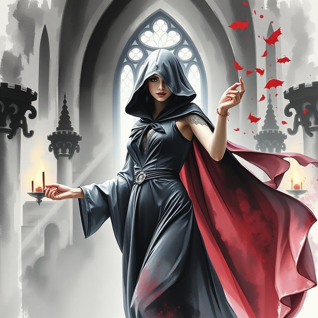 This image depicts a monochrome vampire woman in a medieval dress, cape, and covered head, dancing within a gothic castle. The artwork is rendered in light pastel watercolors.