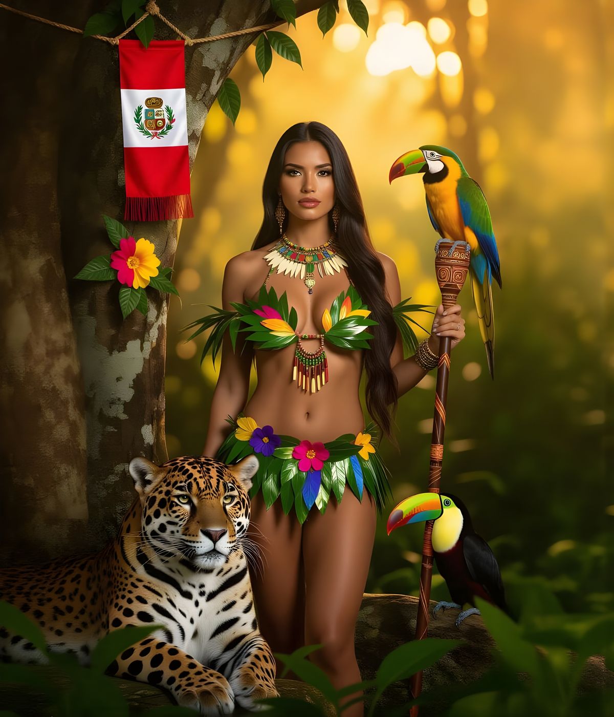 This image shows a Peruvian woman with dark hair in the Amazon rainforest. She wears a leaf bikini and feather adornments, with a jaguar beside her. Peruvian symbols are displayed in the background, depicted in a fantastical style.