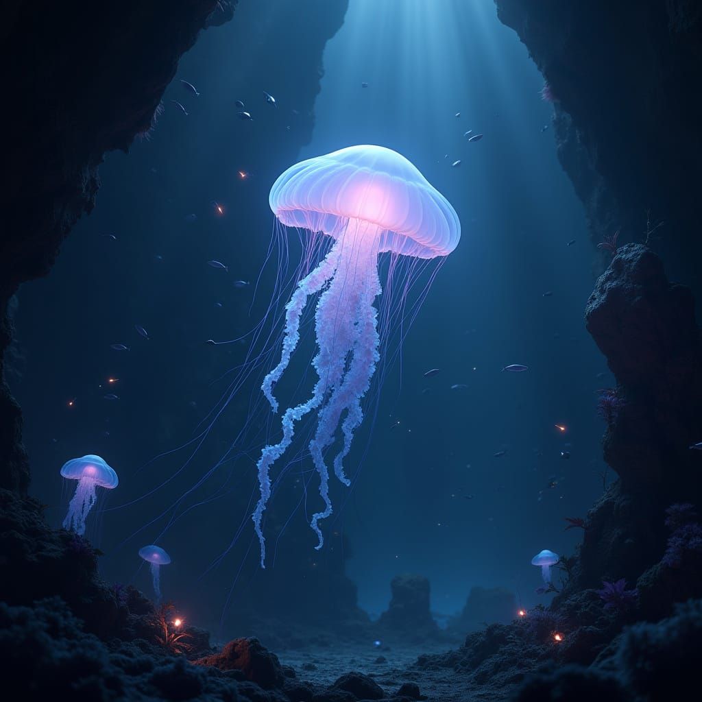 This image shows a bioluminescent jellyfish gracefully drifting through a dark, deep-sea cave. Tiny, glowing fish surround it, with shimmering crystals and alien plants in the style of digital art.