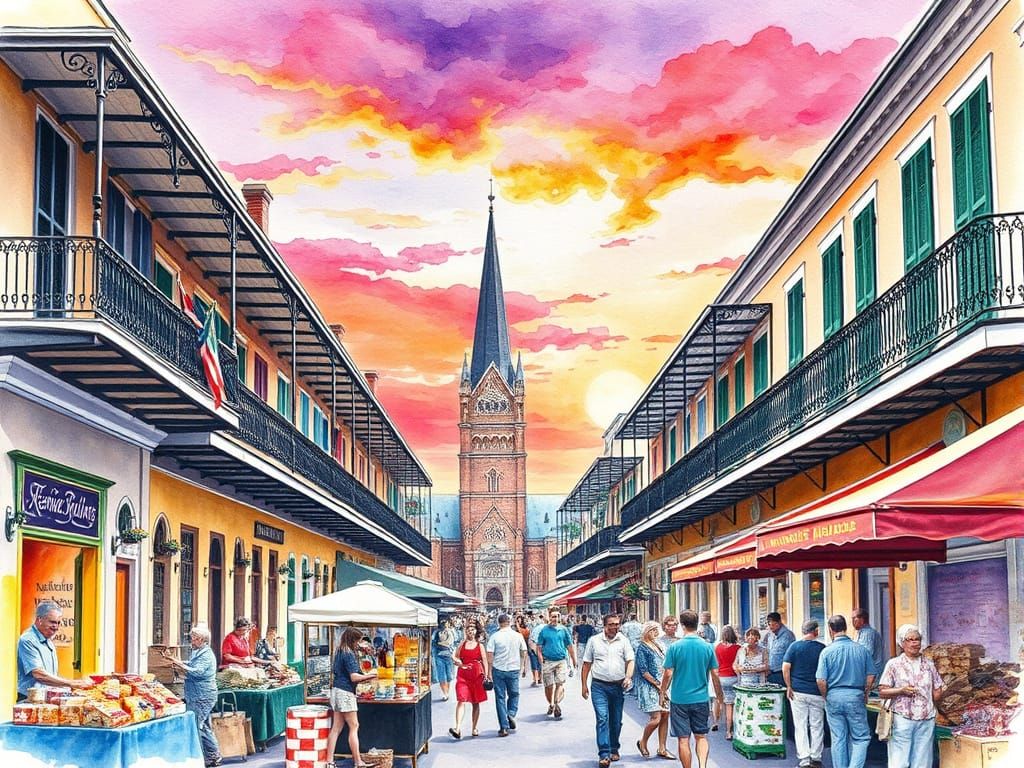 A vivid watercolor painting of a busy marketplace in New Orleans' French Quarter. The scene depicts vendors, colorful buildings with wrought-iron balconies, and a vibrant sky. The artwork is rendered wet on wet with alcohol ink.