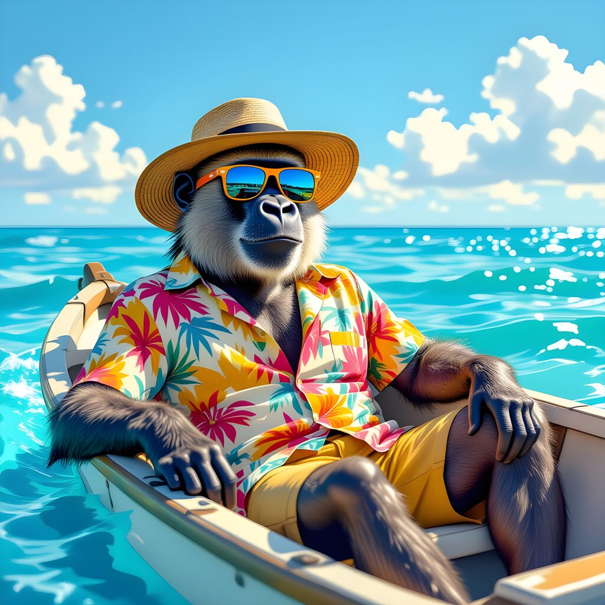 This image shows a baboon dressed in vacation attire, including sunglasses and a sun hat, enjoying a boat ride on clear blue water under a bright sun. It evokes a joyful, relaxed mood.