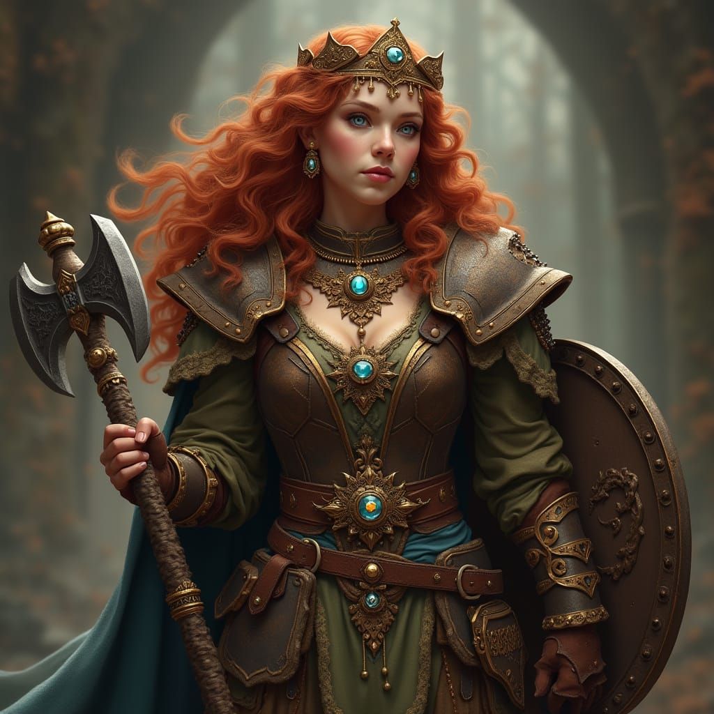 This image shows a powerful female hill dwarf cleric, adorned with curly auburn hair and opulent gemstone jewelry, standing strong in earth-toned plate armor, with a mighty mace, axe, and shield, set against a rich, muted background, reminiscent of a high-fantasy realm, rendered in a detailed, matte pain...