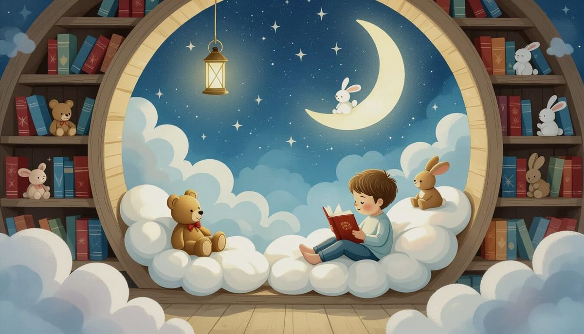 A striking picture of a child reading amongst floating teddy bears and rabbits on candy floss clouds. The walls of the cozy reading nook melt into a starry night sky in this whimsical watercolor.