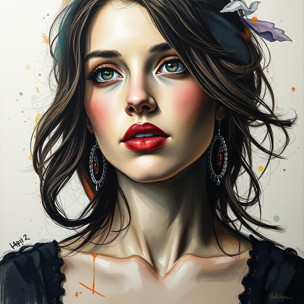 A stunning portrait of a radiant woman rendered in mixed media. This museum-worthy masterpiece features thick brush strokes and layered gouache watercolors on canvas, in an impressionist style.