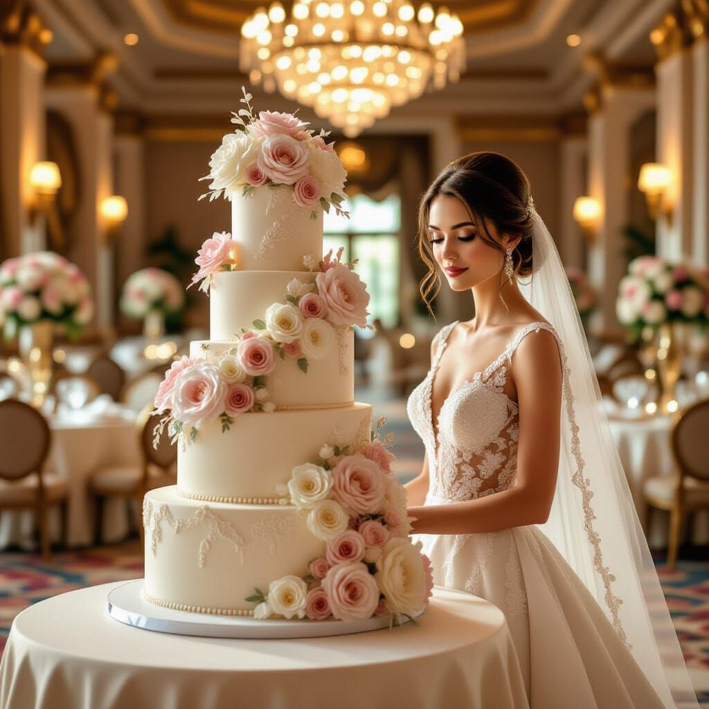 This image shows a bride standing next to a large wedding cake in a ballroom. The cake is decorated with sugar flowers and lace, in a style reminiscent of digital artwork with vivid colors.