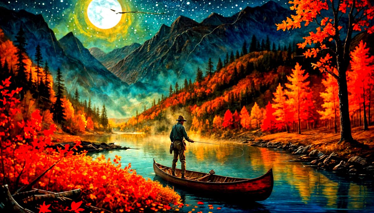 A dramatic and detailed depiction of a fly fisherman casting his line from a rustic canoe into a misty lake, rendered in an ethereal fantasy style.