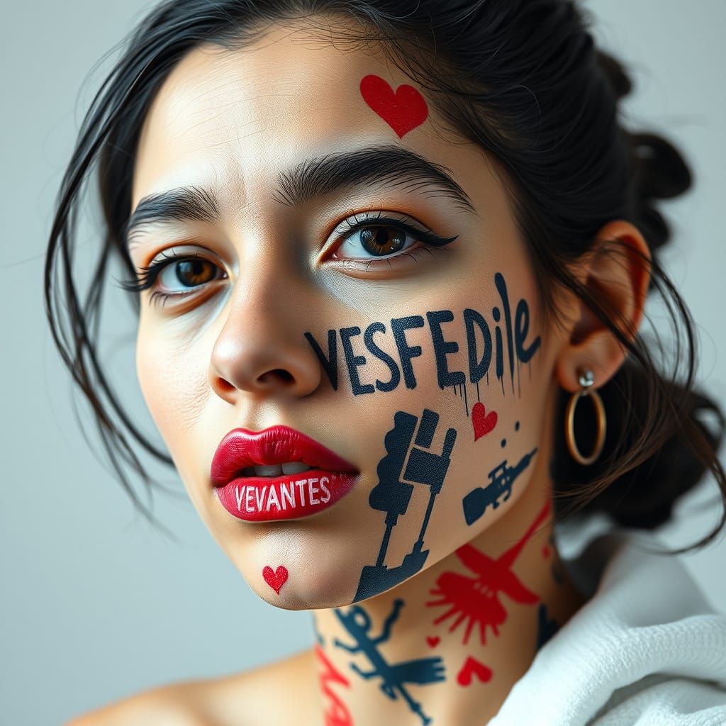 A biopunk renaissance image of a young Venezuelan biohacker, her skin transformed into living Banksy murals that defy regime control. Immune cells and engineered macrophages manifest as vibrant graffiti, highlighting the intersection of art, science, and revolution.