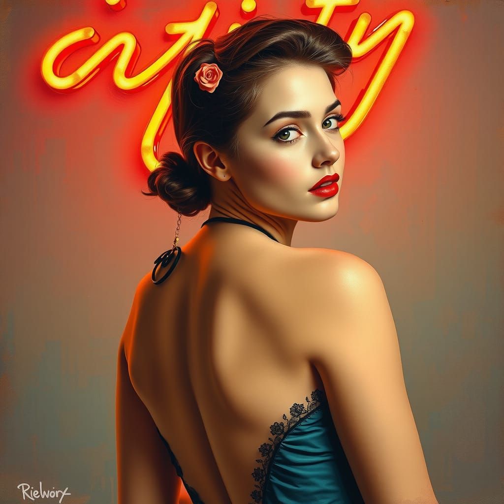 This image shows a beautiful young woman in a glamorous pose. The artwork combines impasto techniques with vibrant, oversaturated colors and warm neon lighting, reminiscent of pin-up art.