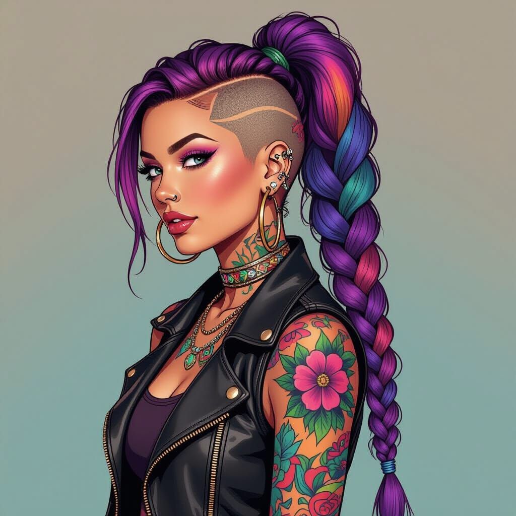 A vibrant pop art style image of a woman with a shaved undercut and long braided ponytail. She features tattoos, piercings and edgy accessories in a comic book aesthetic.