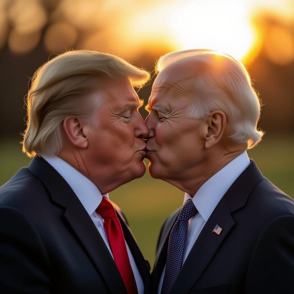 This photorealistic image captures Donald Trump and Joe Biden in a close moment, bathed in warm, cinematic golden hour lighting. Ultra-detailed 8k resolution.