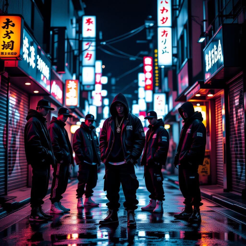 A photorealistic image of a Japanese street gang in a vibrant, neon-lit Tokyo alleyway at night. Captures gritty urban photography with dynamic lighting and reflections on wet pavement.