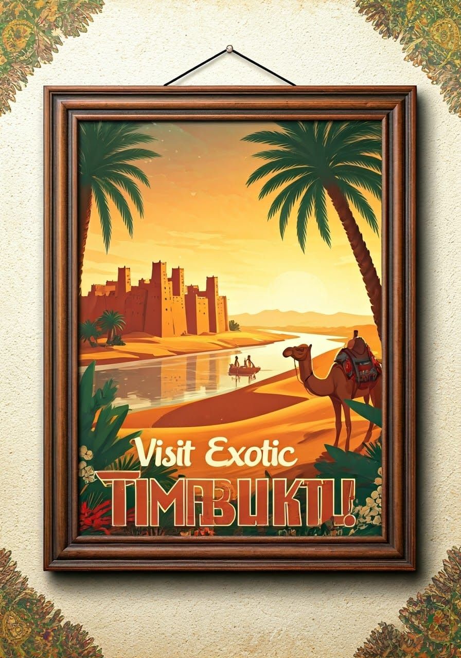 Vintage 1930s framed travel poster advertising an exotic trip to Timbuktu. Hanging on an ornately painted stucco wall.