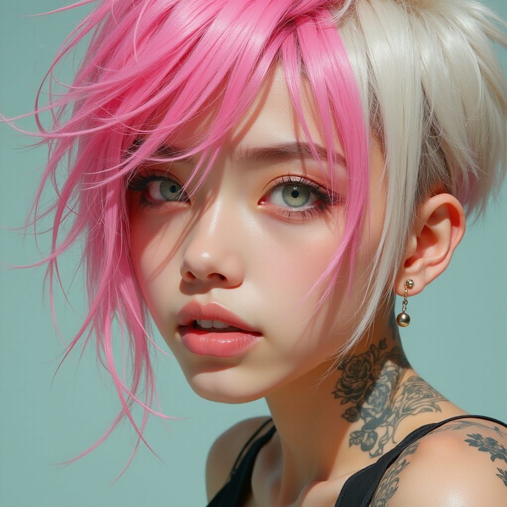 This image shows a detailed, realistic portrait of a Korean idol with a unique pink-white asymmetrical haircut and distinctive soft neon olive eyes. The art features sharp focus and intricate details, conveying a provocative and expressive mood.