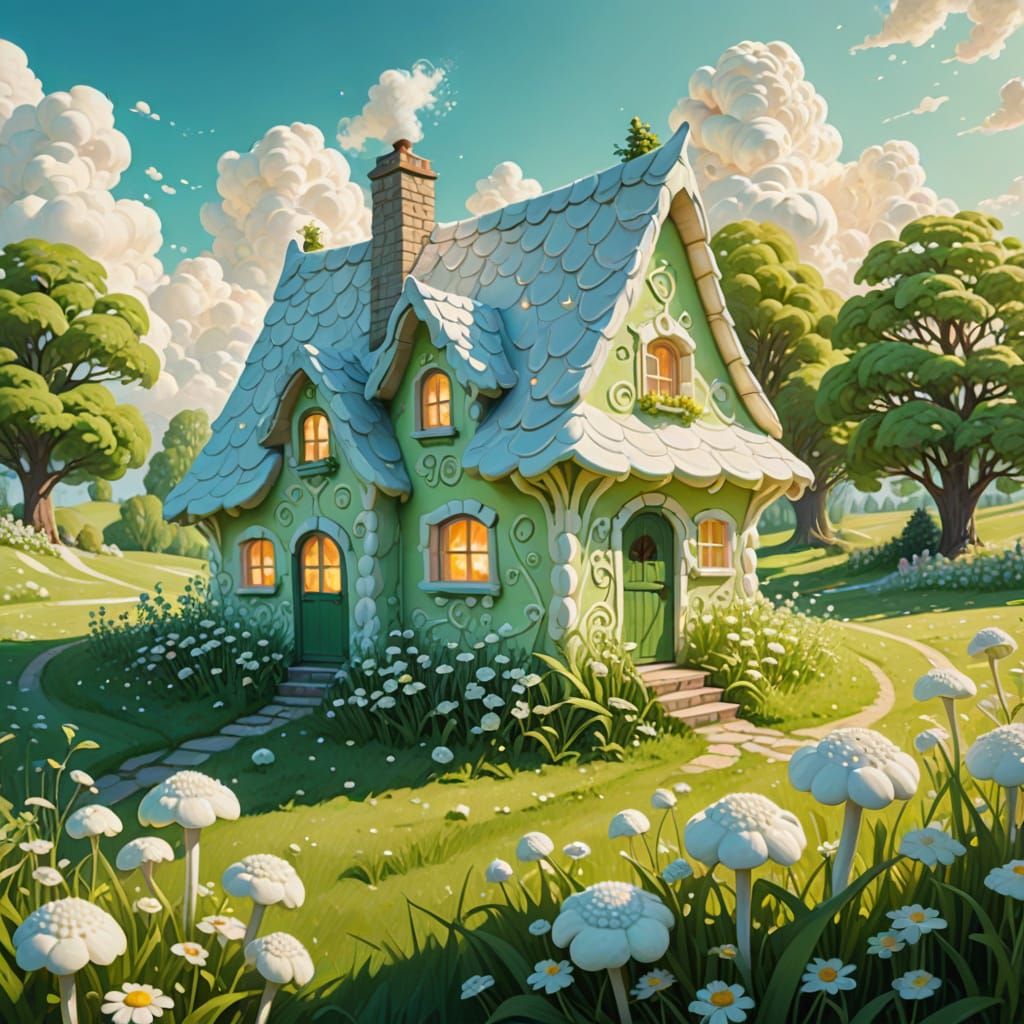 This image shows a whimsical cottage constructed from cottage cheese in a sunlit meadow. The artwork features soft pastel colors, creamy textures, and surreal fantasy architecture.