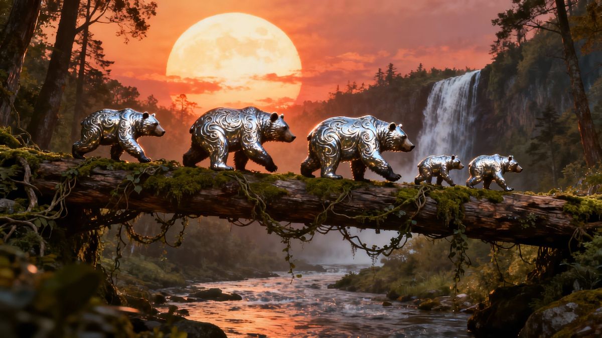This image shows a family of bears crossing a moss-covered log bridge over a river. Features a dramatic sunset, waterfall, and detailed fantasy forest in a hyperrealistic 3D style.