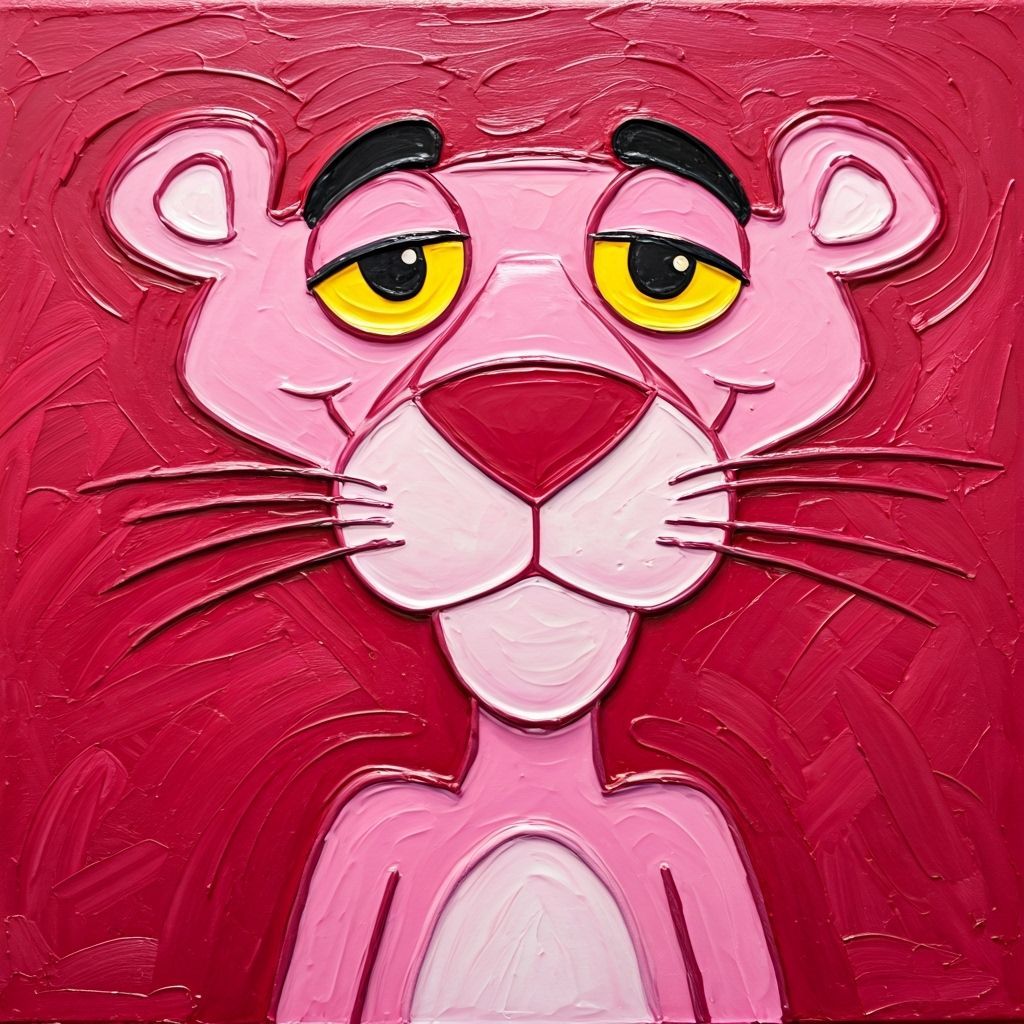 A highly textured encaustic impasto painting of the iconic Pink Panther character. Thick, raised brushstrokes