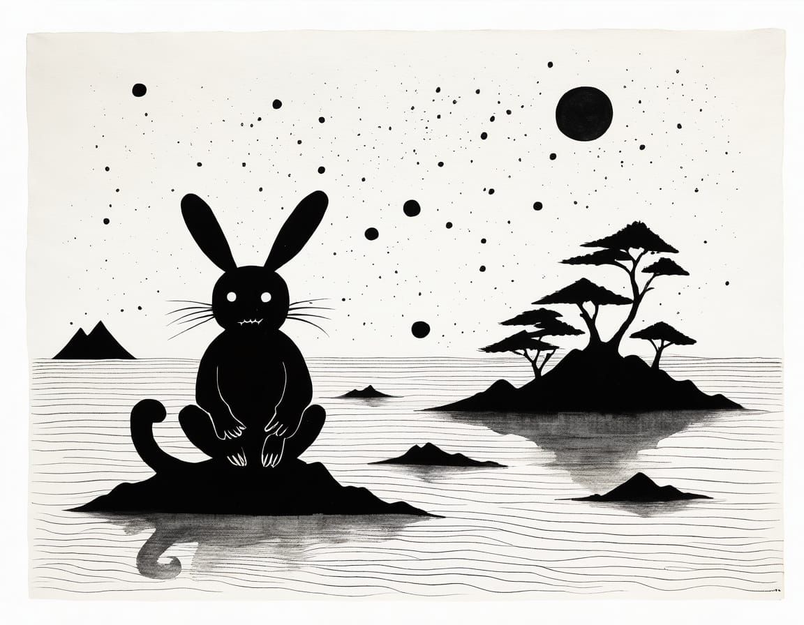 A minimalist Sumi-e ink drawing of a lonely monster in a magical, quirky primitivism style. This image evokes the styles of Miro, Kubin, and Hokusai.