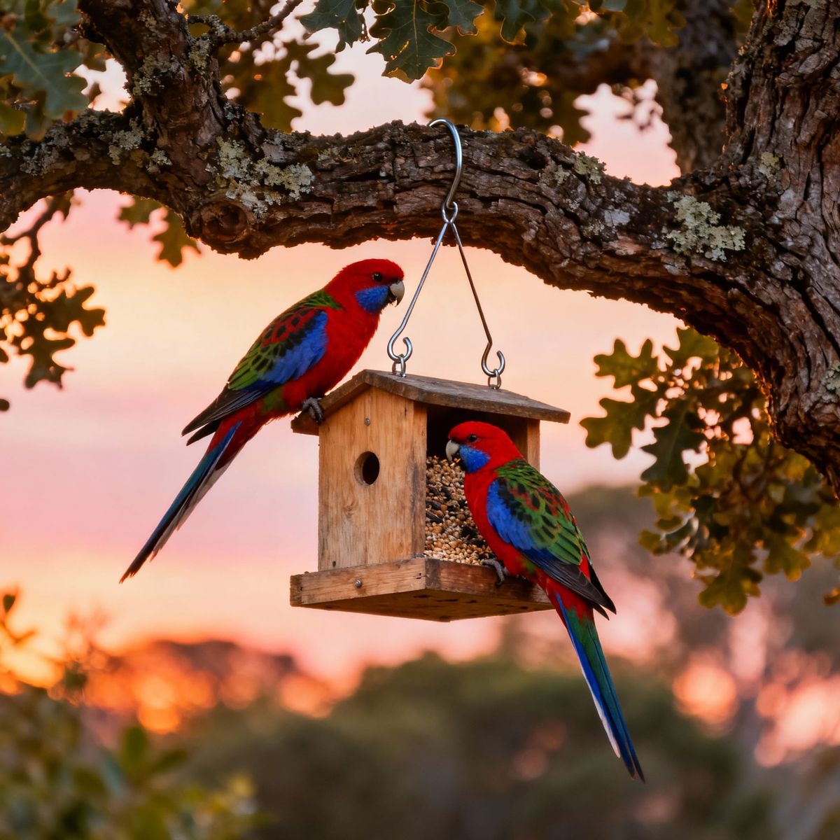 This image showcases vibrant red rosellas feeding from a bird feeder at sunrise, set against the backdrop of a grand oak tree.