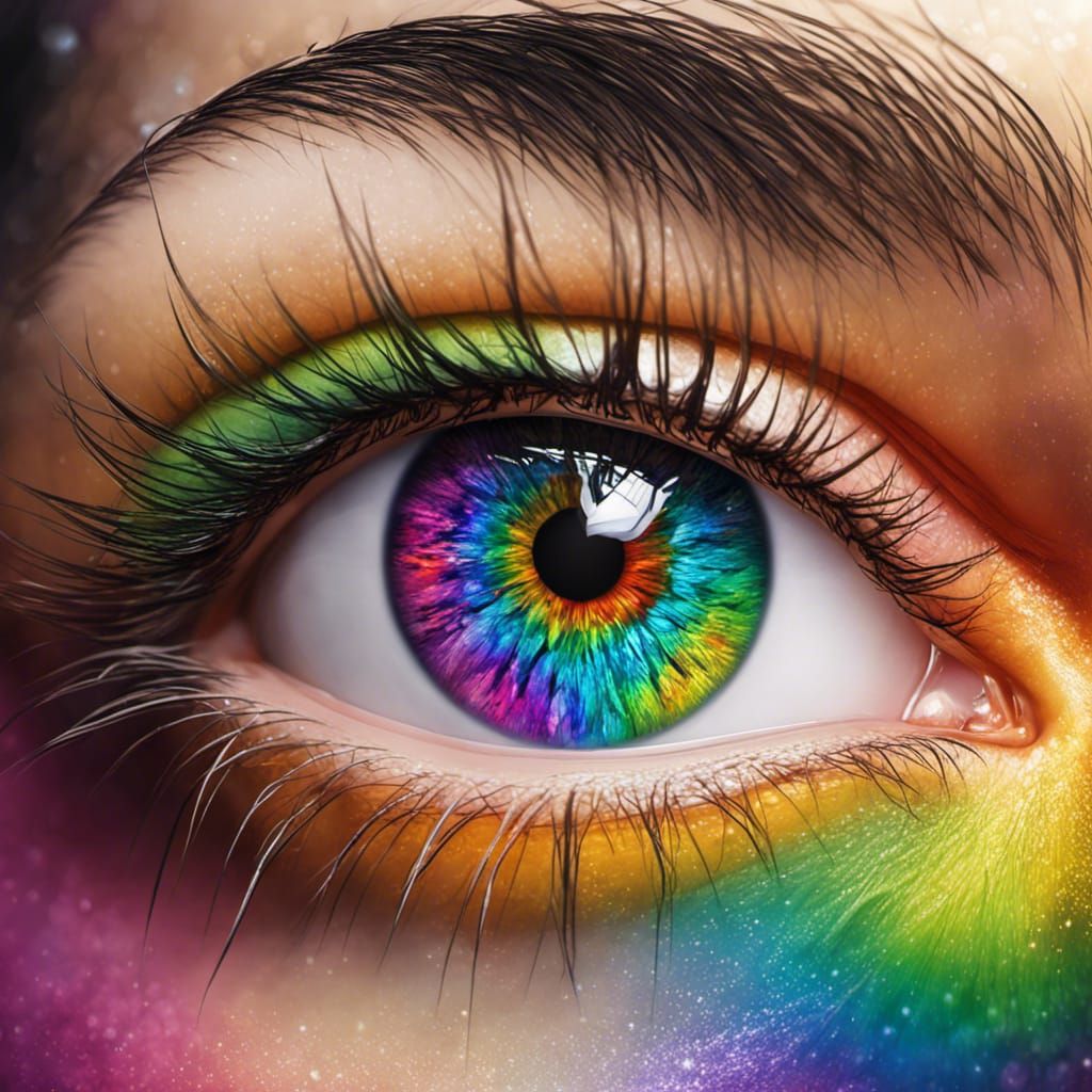 This image depicts a highly detailed, multilayered rainbow eyeball. The anime and manga-inspired artwork features sharp details, intricate composition, and incredible lighting in deep color.