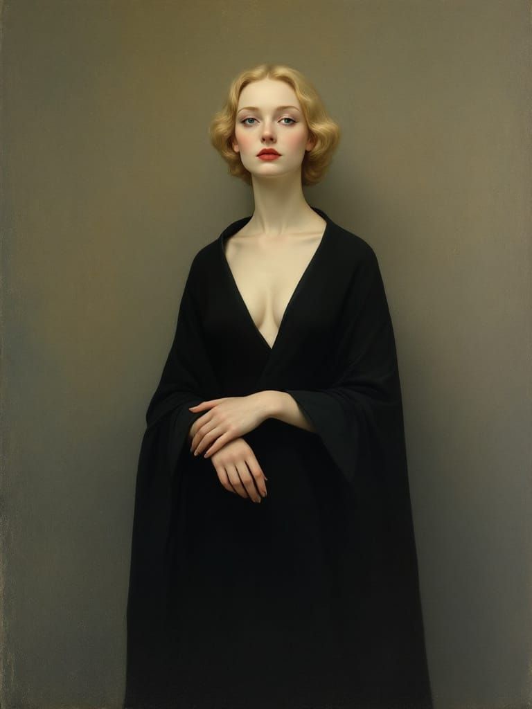 This image features a full-body portrait of a 1950s pin-up woman with bold eye contact, rendered in a style inspired by early Netherlandish devotional art and French Symbolism, emphasizing symbolic clarity and contemplative unity.