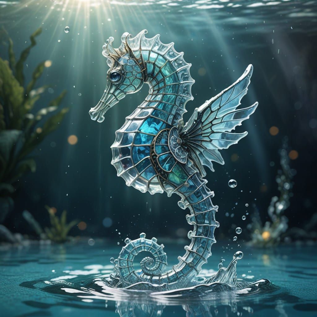 A striking picture of a glass seahorse emerging from water, its form resembling a spectral spirit. The seahorse has iridescent wings and a soft, misty aura in triadic colors. Digital matte painting.