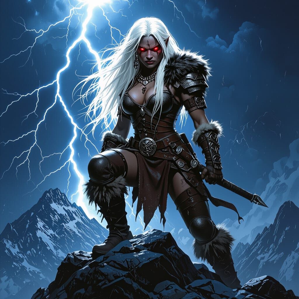A striking picture of a barbarian queen standing on a mountain of treasure. She has long white hair, red eyes and wears weathered armor, illuminated by lightning in a dark fantasy scene.