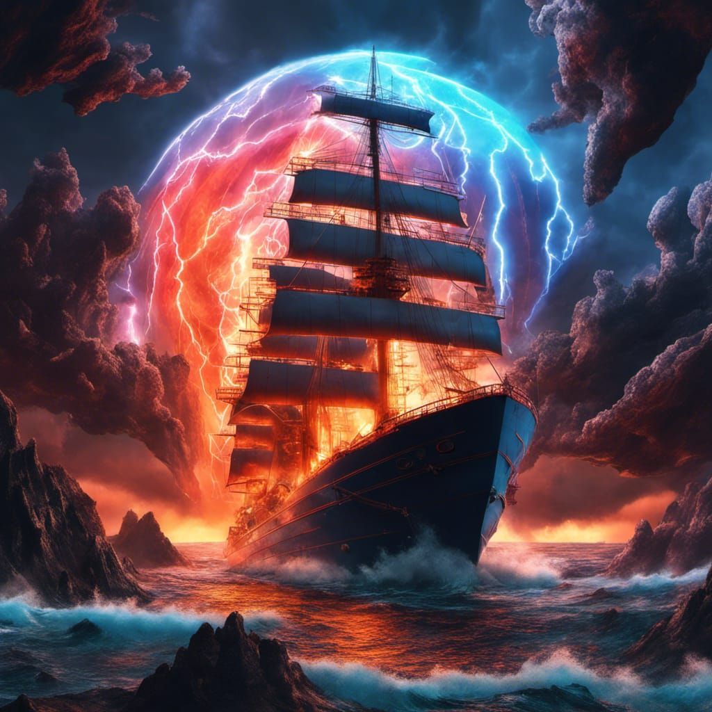This image shows a lava lamp containing a detailed spaceship interior. The scene is set against a backdrop of lightning and storms, rendered as an intricate digital illustration.