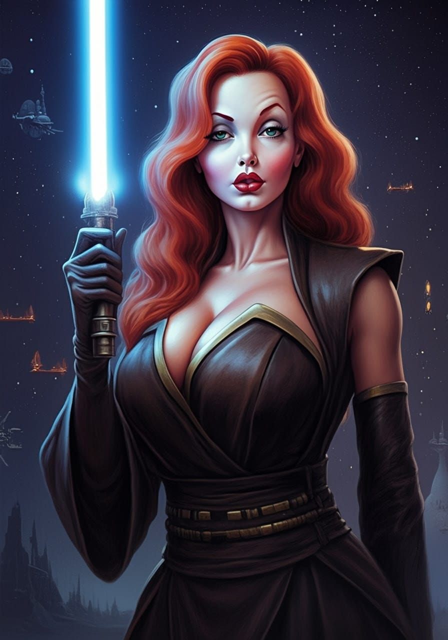 A striking picture of Jessica Rabbit reimagined as a Jedi Knight, presented as a movie poster. The image is a detailed concept art piece with acrylic painting elements.