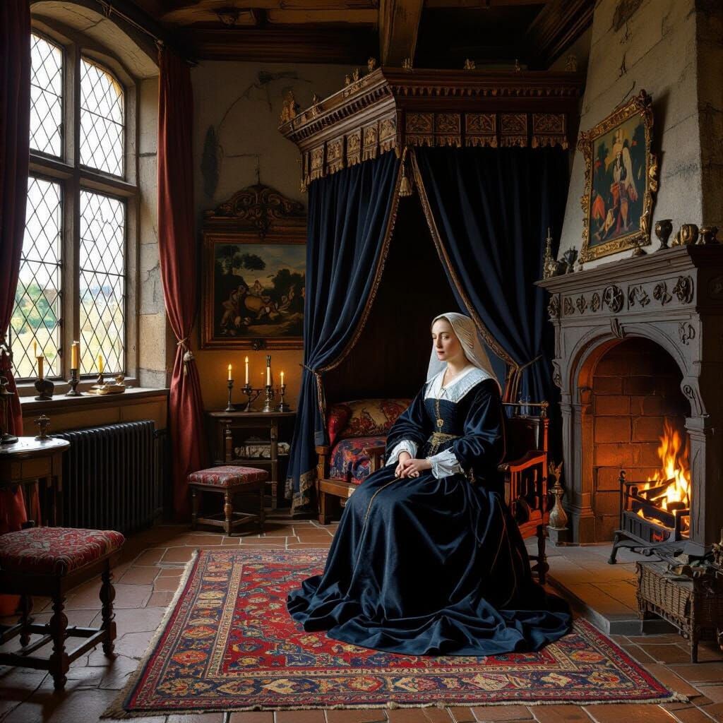 A captivating image of a woman in a medieval manor bedroom. The room features a four-poster bed, fireplace, and warm lighting, rendered with realistic detail and golden light effects reminiscent of Renaissance painting.
